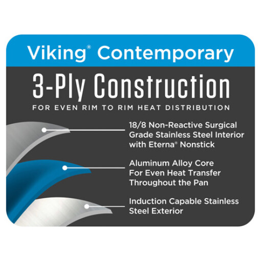 The Viking Contemporary 3-Ply Stainless Steel 11-inch Nonstick Grill Pan combines the exceptional performance of 3-ply bonded stainless steel cookware with a nonstick grill pan. Viking contemporary cookware combines a layer of aluminum alloy sandwiched between heavy-gauge stainless steel. The aluminum core provides exceptional heat transfer throughout the cookware transferring heat evenly across the bottom and sides of the pan for rim-to-rim cooking, while the magnetic stainless steel exterior makes it incredibly durable and safe for all cooktops, including induction. This non-stick fry pan features dual-layer Eterna PFOA-free non-stick coating, for superior release and healthier cooking resulting from the need for little to no cooking oils or fat while retaining the searing ability of a traditional fry pan. The raised ridges provide the perfect sear markings for restaurant quality presentation at home. The raised ridges also keep the food above any fats or oils, to aid in healthier cooking. The Viking signature stay-cool handle is ergonomically designed for a secure grip, Comfort and balance, while remaining cool to the touch. The handle features a finger guide that helps you establish the perfect grip on the handle. From stovetop cooking to oven finishing this cookware is designed to help you deliver professional results in your own home.