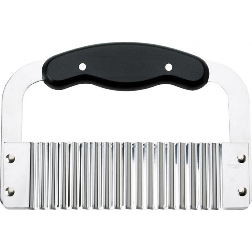 This black handled crinkle cut knife is made of heavy gauge aluminum. This stainless steel wave sliver has a wavy blade for crinkle cutting of vegetables and other food items. Use it to trim the edges of handmade ravioli, make crinkle cut french fries, or wave cut vegetables-like carrots and zuchinni. Easy and fun to use.