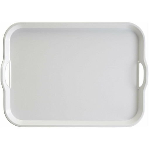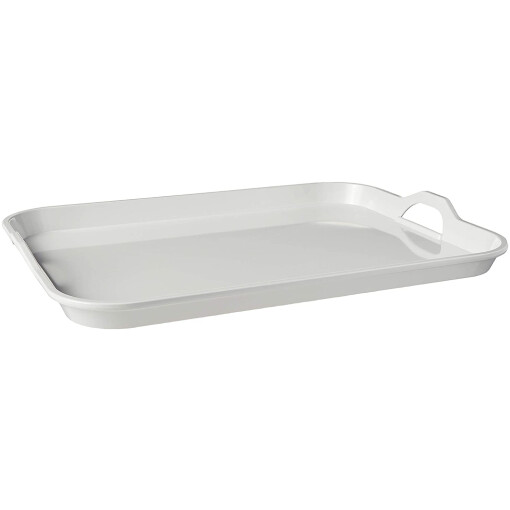 With the look of ceramic, this serving tray is sturdy enough to support piles of dishes and food, while still being comfortable to lift. Strong and durable for indoor as well as outdoor use. Perfect for all occasions, this large tray is made of Melamine. Hand polished, it will always remain shiny. Strong and durable with comfortable handles. Heat resistant to 360°F. Dishwasher safe.