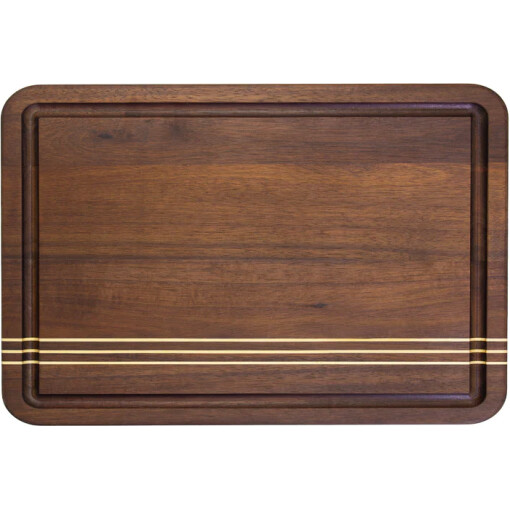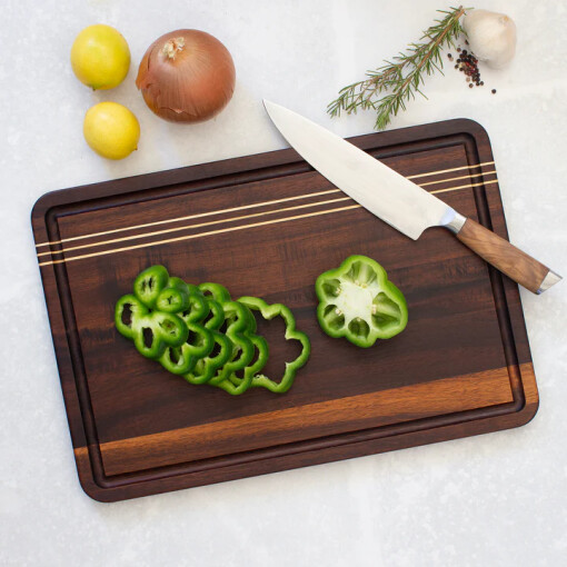 Elevate your food prep with Rock & Branch® Acacia Wood Pinstripe Cutting Board! Crafted from acacia wood for a durable, beautiful cutting board, this knife-friendly butcher block is perfect for all your slicing, dicing and chopping needs. This extra-large board is great for carving and cutting meat, slicing large vegetables and fruits and serving cheese and crackers. The board features a juice groove around the exterior to trap and hold excess juices that run off from roasts, meat and juicy fruits. This cutting board easily doubles as a chic charcuterie board. The rich, dark tones of the acacia wood paired with the pinstripe detailing adds a touch of elegance to every spread. The board includes recessed handles so you can easily prep food in the kitchen and seamlessly carry it to the dining room for serving. The Rock & Branch® Acacia Wood Pinstripe Cutting Board measures 18-1/8″ x 12-1/8″ x 5/8″.