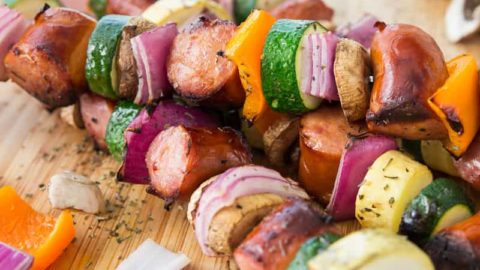 Grill skewers, 8 to 10 Minutes until sausages are browned and vegetables slightly charred.