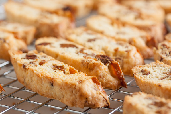 Take the loaves out of oven and using a serrated knife, cut dough on the bias into 1-inch cookies. Lay cookies cut side up on baking sheets and bake until golden and dry, another 10 Minutes. Transfer cookies to cooling racks. Store in an airtight container.