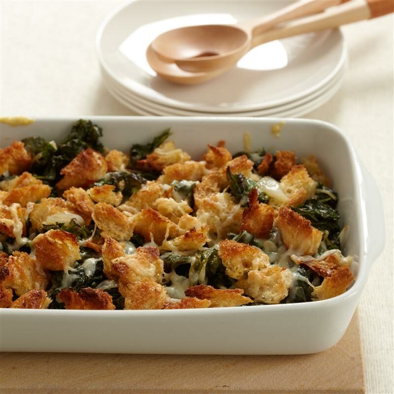 Transfer the kale to an 8-by-10-inch glass baking dish. Scatter the cheese over the kale and top with the croutons. Bake for about 20 Minutes, or until the cheese is bubbling and the croutons are golden. Let stand for 5 minutes and serve.