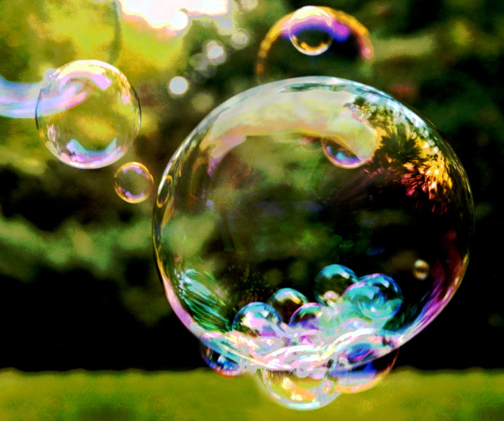 To make really big bubbles, pour soap bubble liquid into a large tub or bucket. Bend a wire hanger into a hoop. Hold it by the handle and dip into the liquid. Raise it up slowly and wave it through the air gently—wow!