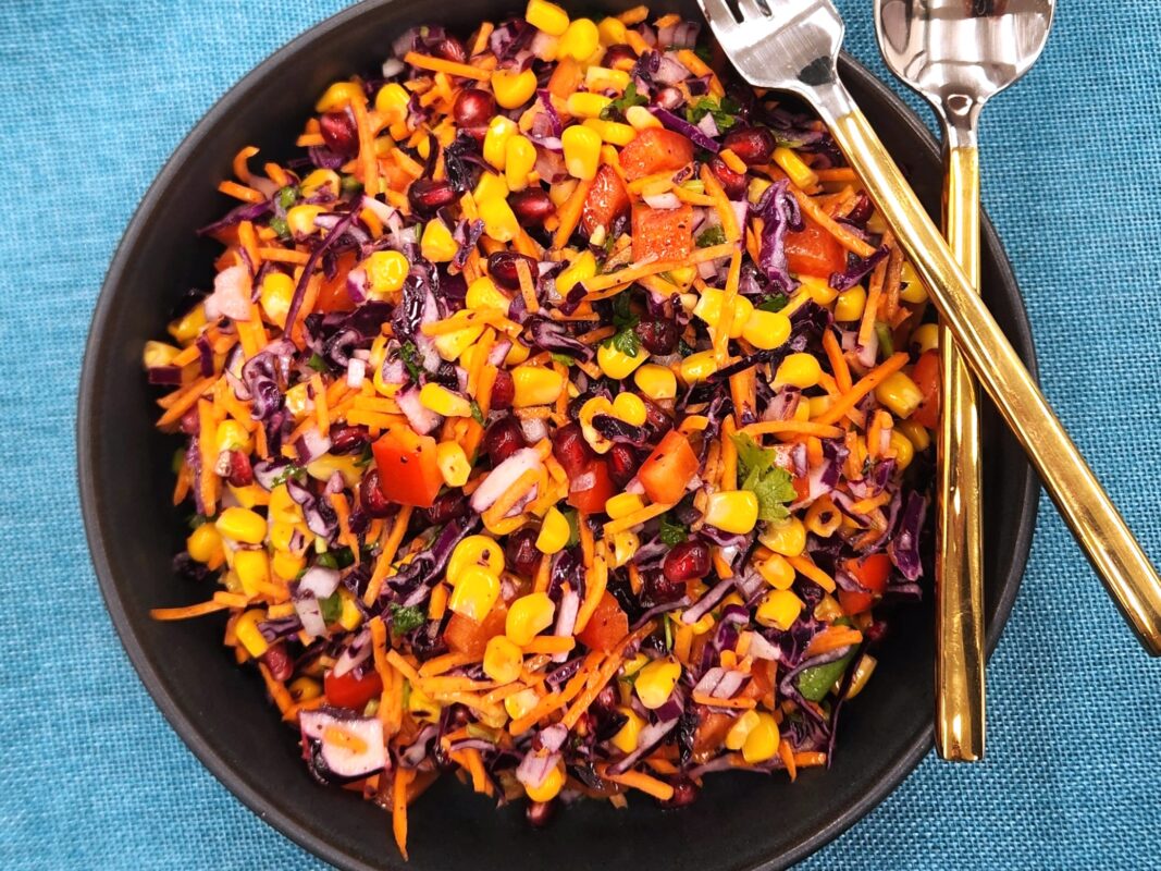 Toss cabbage, carrots, corn, pepper, corn kernels and pomegranate seeds in a large bowl.Â
