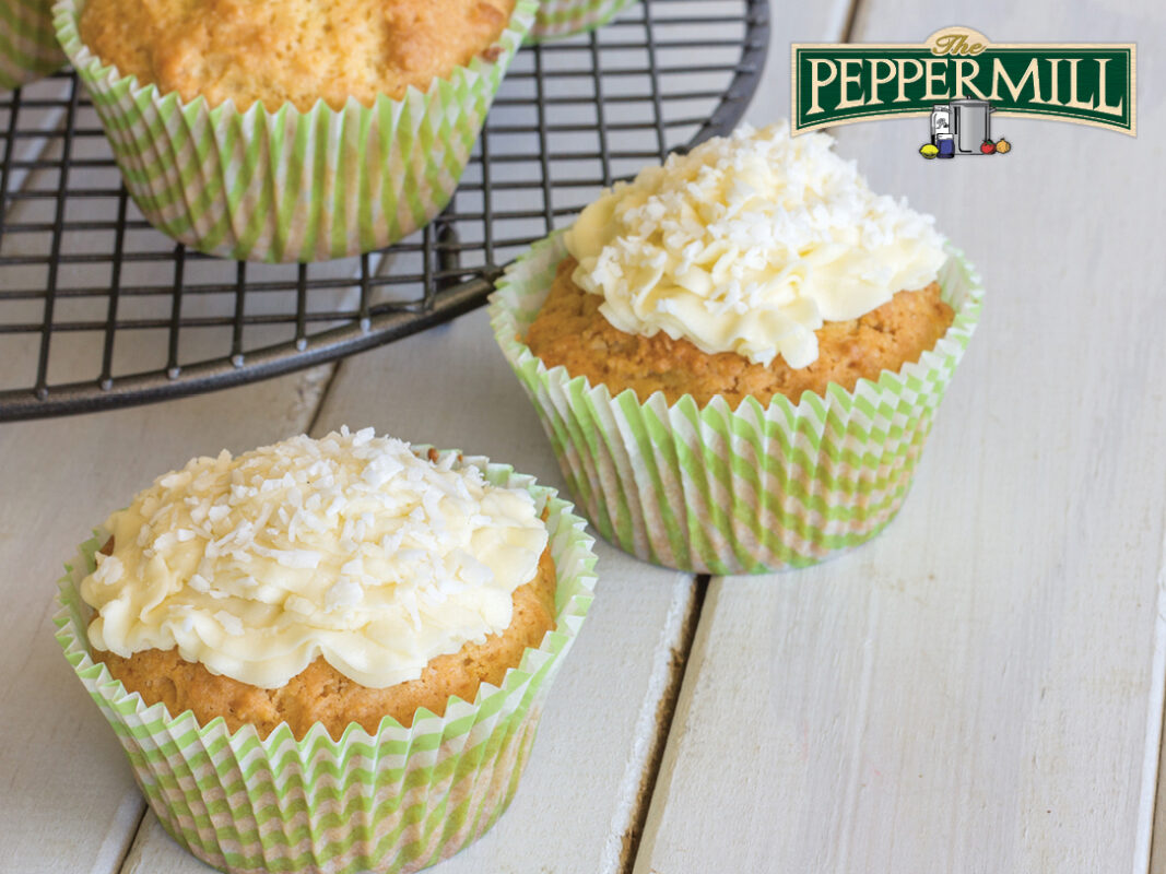 Mix cream cheese, butter, vanilla and confectioners’ sugar until well-combined. Remove muffins from pan and spread frosting on each muffin. Top with a generous sprinkle of flaked coconut.