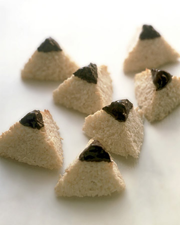 With damp hands, mound a tablespoon of coconut mixture in your palm. Press a chunk of chocolate into the center and bring mixture together over the chocolate, forming a neat ball. Place balls 1 inch apart on your baking sheet. Continue until you have used all the coconut mixture.