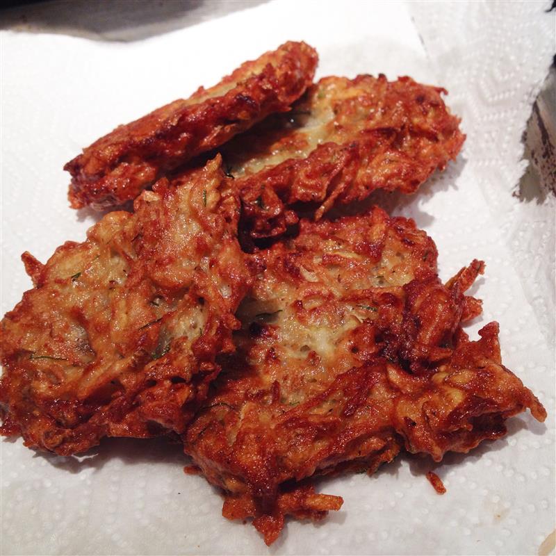 Add half a cup of oil to a mediumskillet and heat it to 370 degrees F. Use a heaping tablespoons of the latke mixture for each. Place 3-4 tablespoons into the oil and cook until brown on 1 side, approximately 2 Minutes. Using a spatula, flip the latkes and continue to cook until brown on the other side. Remove from oil to a paper towel lined platter. Continue with the remaining mixture. Arrange the latkes on a serving platter and serve immediately.