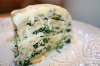 Butter a 9" round baking dish. Place 1 crepe in dish. Spread with 2 tablespoons spinach mixture. Top with a crepe. Spread with 2 tablespoons of mushroom mixture. Top with another crepe. Continue alternating crepes with layers of spinach and mushroom fillings, ending with a crepe. (Up until this point, the gateau may be prepared in advance.)