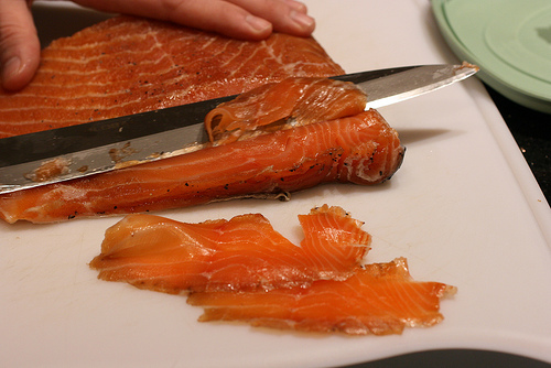 Use a long sharp knife to slice the lox thinly. Serve on bagels and cream cheese.