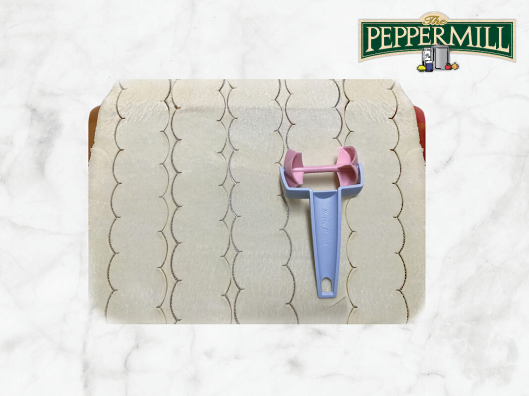 Position the dough horizontally, facing you. Using the Betty Bossi Rose Roller, cut the dough into 6 scalloped strips.