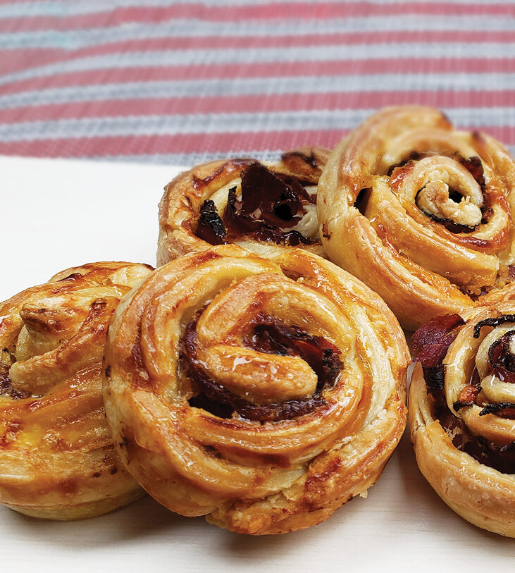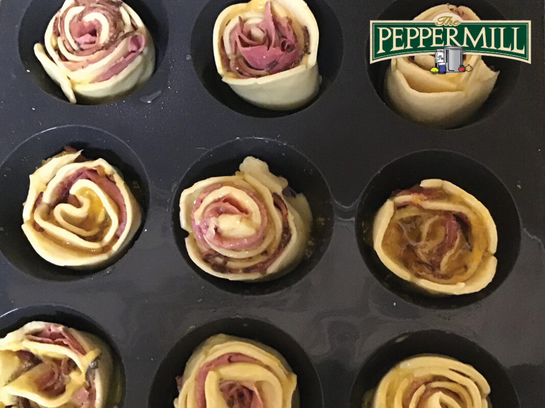 Brush honey mustard on the dough. Top with sliced pastrami. Brush with some more honey mustard. Roll up the pastry and slice in half through the center of the roll so you have 2 roses.