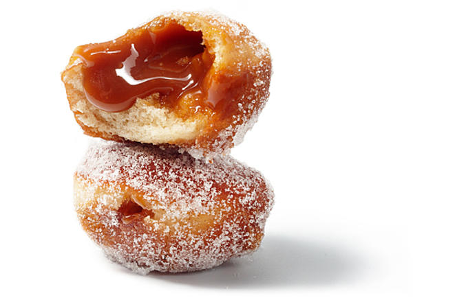 Place caramel in a piping bag fitted with a filler tip. Poke a hole in the side of each donut and pipe in a small amount of filling. Dust with confectioners’ sugar. Serve immediately.