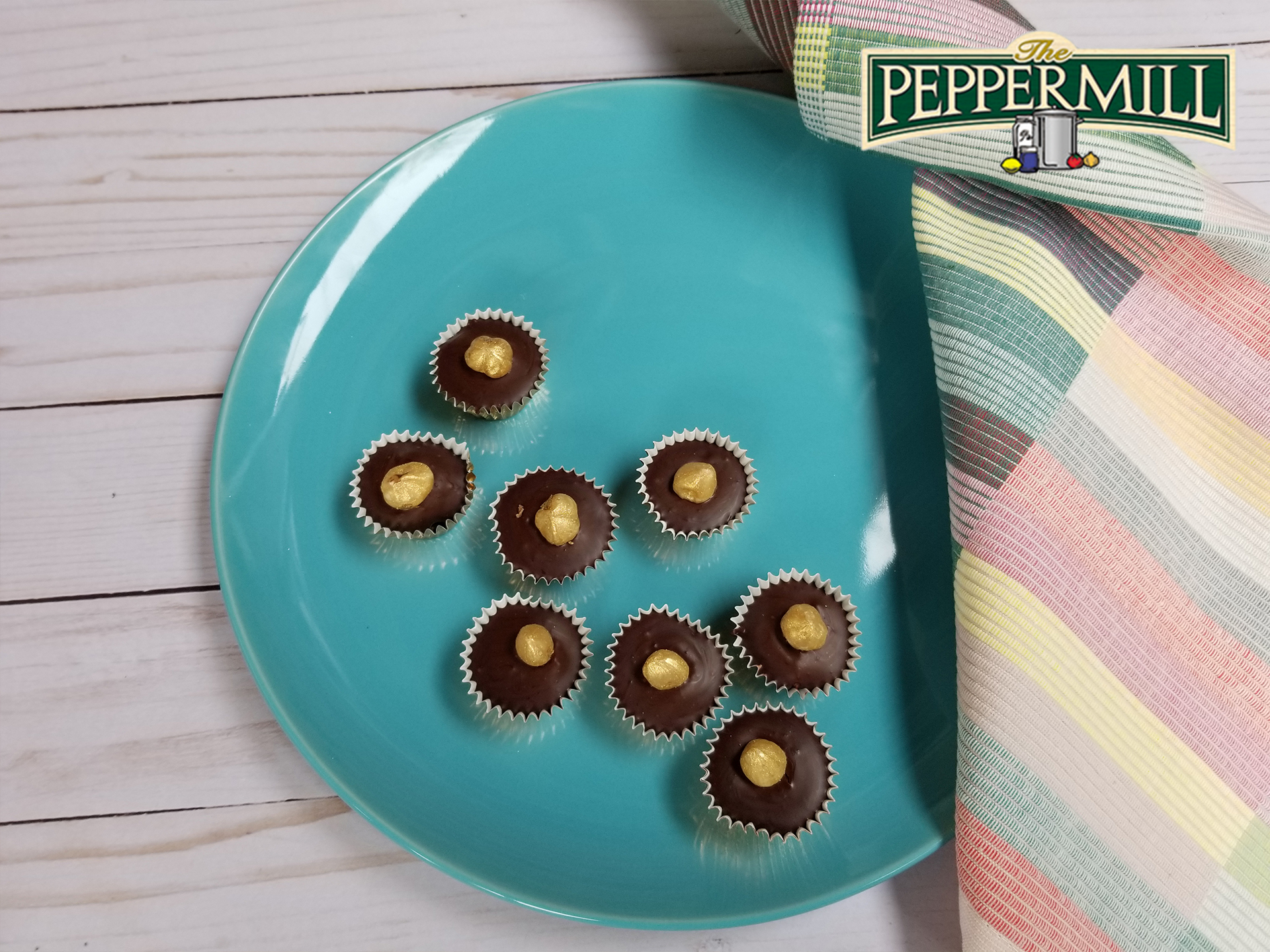 Melt the bittersweet chocolate coating and place in a disposable pastry bag. Fill the truffle cup with the chocolate until you have a smooth level top. Top with gilded nuts. Store in an airtight container at room temperature.