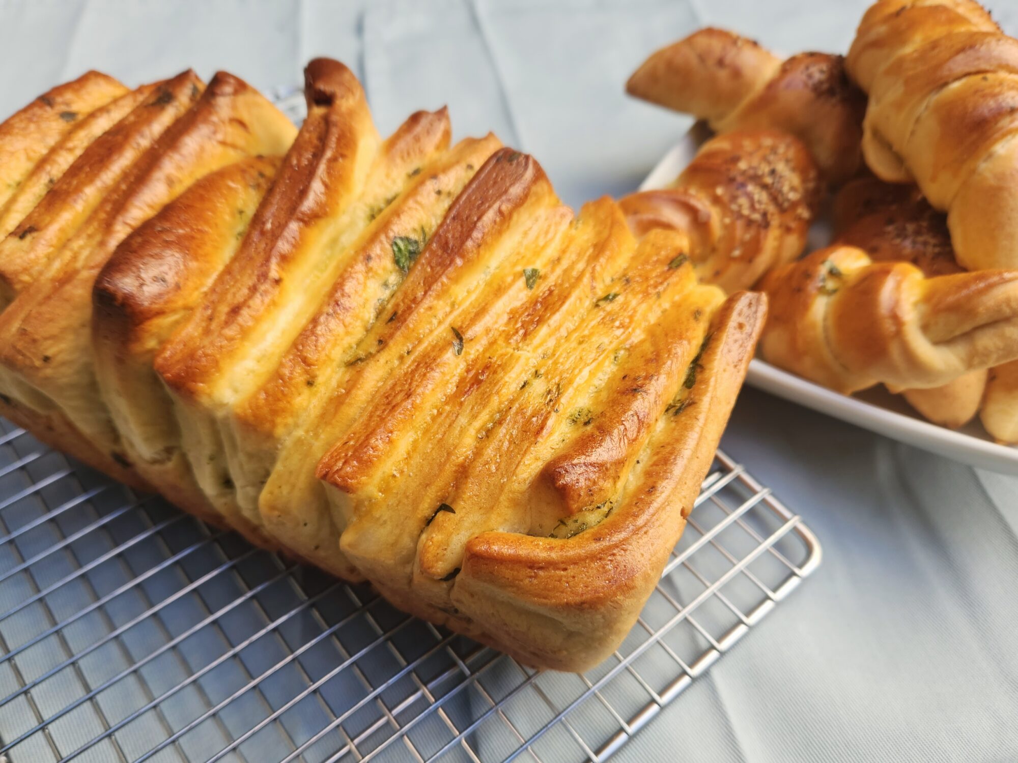 Using a pastry brush, brush herb mixture onto dough, reaching end to end. Add shredded cheese if you’re making it dairy.