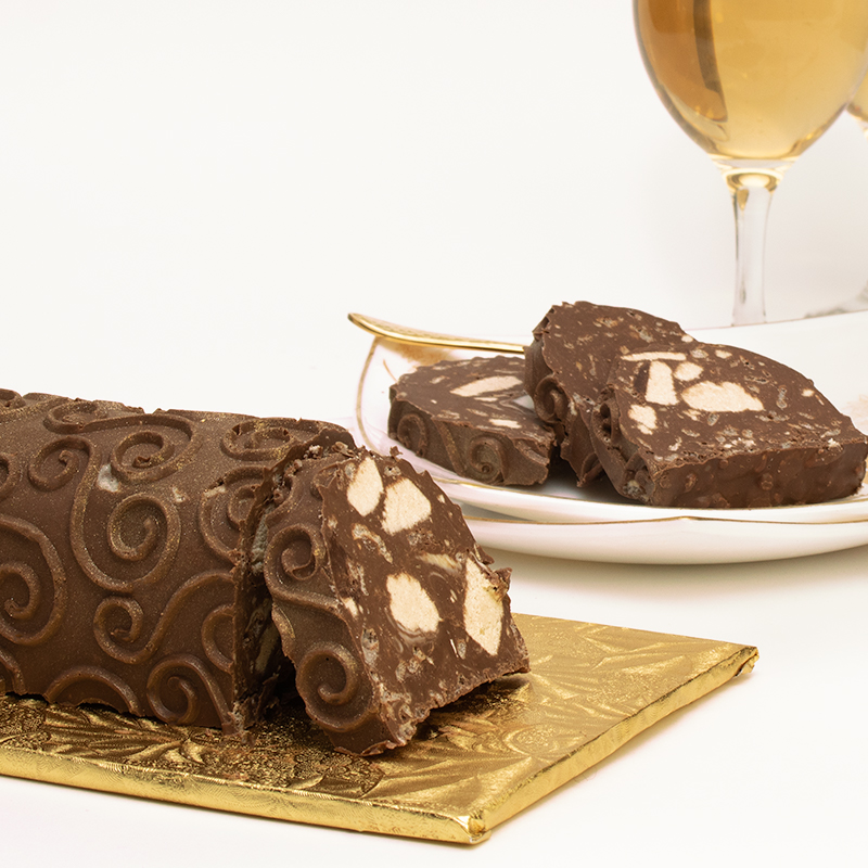 Pour the chocolate mixture into mold and put into the refrigerator to set (about 45 minutes). When the log is firm, release the two ends with a thin spatula and pull the overhanging acetate sheet to remove from the mold. Invert the log onto a tray. Gently remove texture sheet.