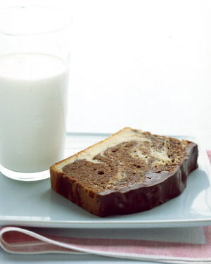 Pour half of batter into melted chocolate; stir well. Alternating between remaining plain batter and the chocolate batter, drop large spoonfuls of batter into the prepared pan. When pan is filled, use a table knife to cut through mixture with a swirling motion.