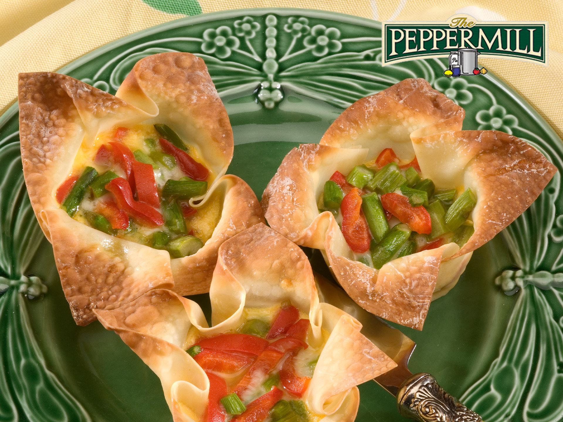 Grease a 12-cup muffin pan. Brush each egg roll wrapper lightly with oil. Place one square in each muffin cup, pleating slightly to fit. Spoon 3-4 tablespoons of filling into each cup. Bake for 20 Minutes. Remove from oven and let quiches rest to allow eggs to set before removing from pan.