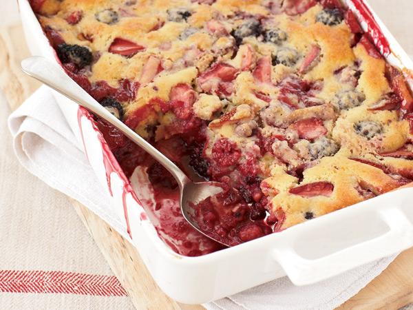 In large bowl whisk together flour, sugar, lemon zest and baking powder until combined. In a separate bowl, whisk together egg, juice, oil and vanilla. Add to the dry ingredients and mix until just combined. Spoon the batter on top of fruit.