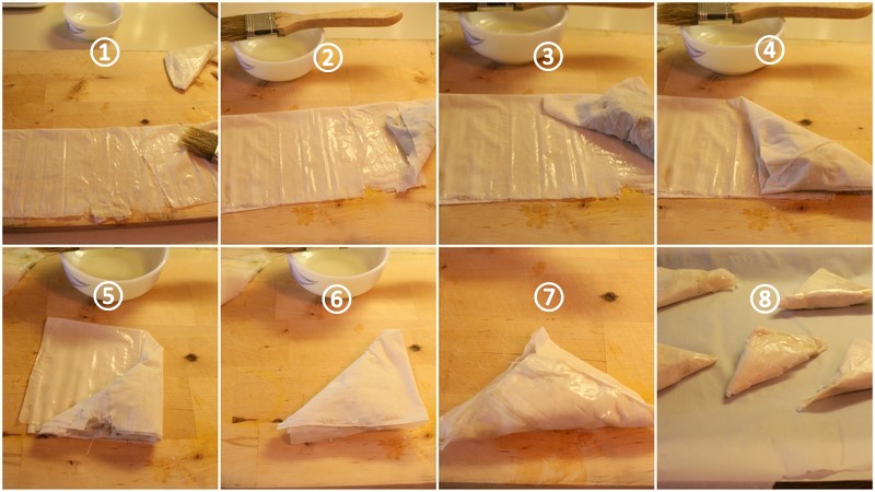 Cut the stack of phyllo sheets crosswise into eight equal strips. Place one tablespoon of filling near one end of each strip. Lift up one corner diagonally to cover the filling. Fold the point of the filled corner so it meets the opposite side of the strip and forms a triangle. Fold the triangle straight so the filling is completely enclosed. Continue folding the triangle onto itself, until you reach the end. Brush the outside of each triangle with oil.