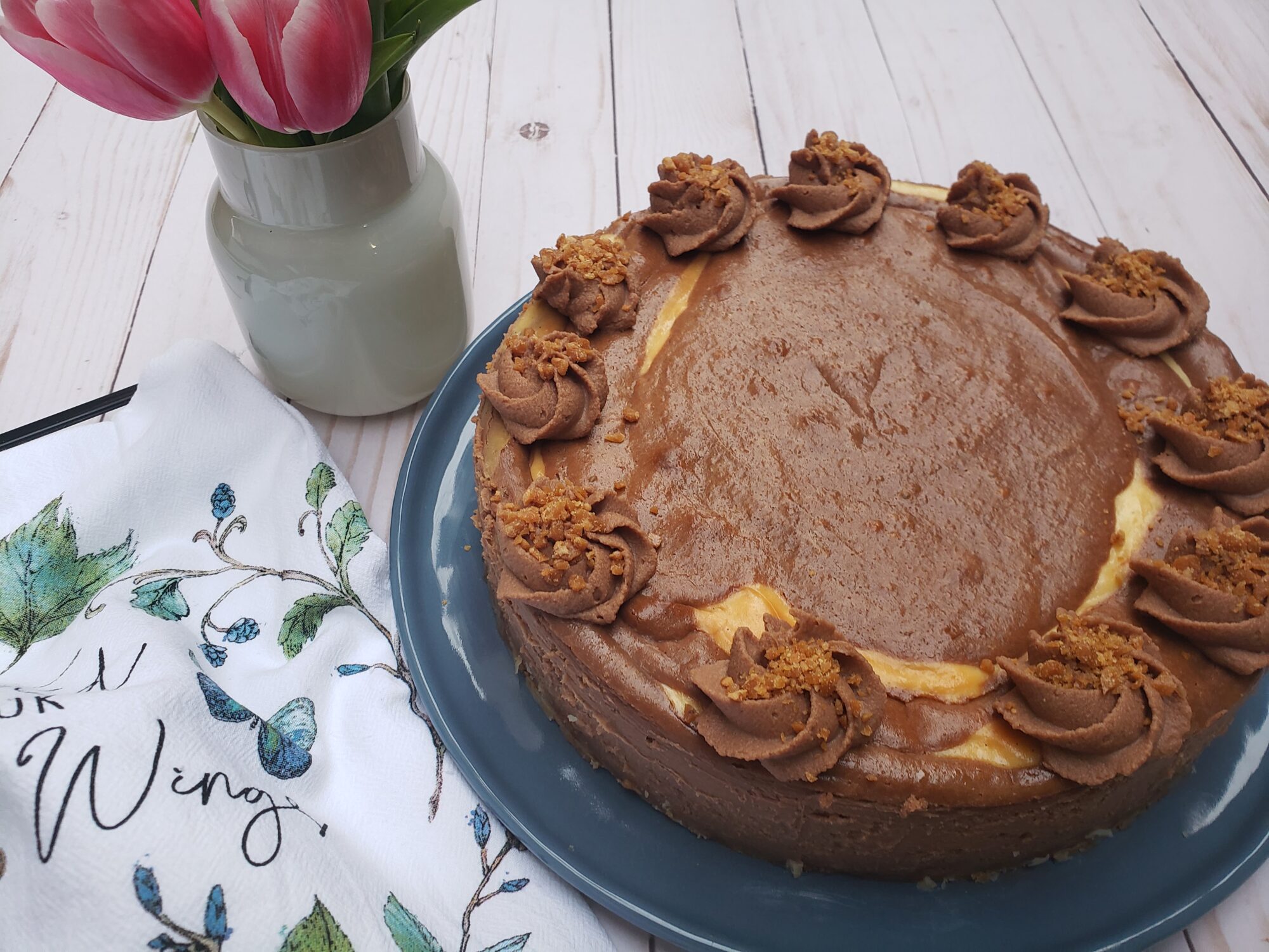 Using the whisk attachment, beat until fluffy. Transfer to pastry bag fitted with start tip. Pipe rosettes around cheesecake and sprinkle with chopped viennese crunch.