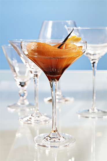 Place 2 scoops of pear sorbet in each dessert bowl and spoon warm pear compote over. Stand one pear chip into each sorbet scoop. Serve immediately.