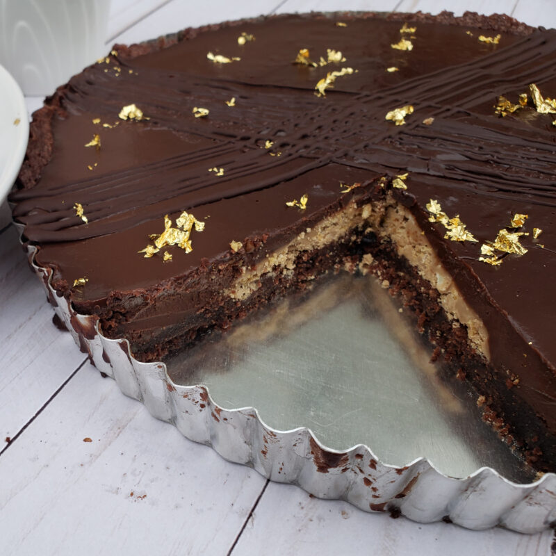 Lightly grease an 11” removable-bottom tart pan. Place pecans in the bowl of food processor fitted with the blade attachment. Pulse until finely ground. Add flour, cocoa and sugar. Pulse to combine