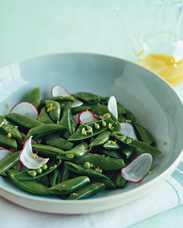In a medium-sized bowl, combine snow peas, scallions and radishes. In a separate bowl, whisk together vinegar and oil. Pour over vegetable mixture and serve.