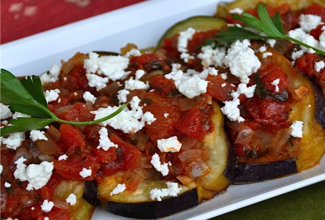 Combine the tomatoes, basil, garlic, and additional salt and pepper to taste, in a bowl, and spoon the mixture over the eggplant. Top with crumbled feta cheese, and bake for 45 Minutes.