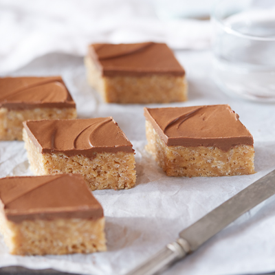 Cook corn syrup and sugar on stove until it boils. Remove from heat and add peanut butter and Rice Krispies. Stir and spread on buttered 9 x 13 inch pan. Melt chocolate and butterscotch chips. Spread on top. When cool, cut into squares or bars.