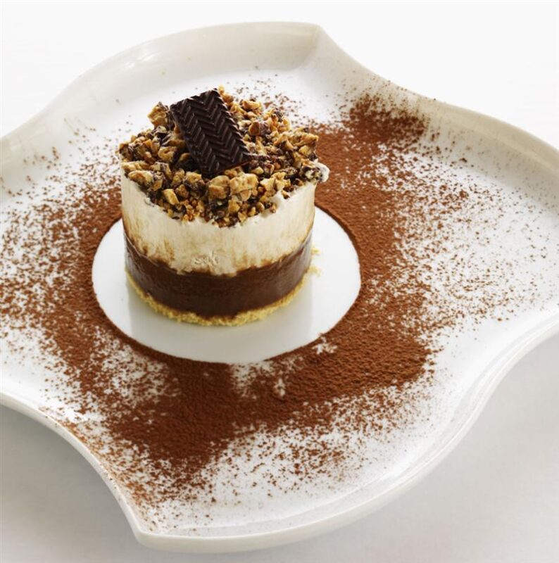 In the bowl of an electric mixer, beat the whipped topping until peaks start to form. Add the dissolved coffee and vanilla and continue to beat until the peaks are stiff. Spread the topping evenly over the mousse layer and freeze until set. Once the whipped topping is set, sprinkle with the chopped Viennese crunch. Freeze until ready to serve.