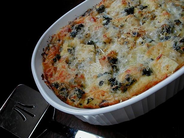 Butter a 9 x 13 x 3 inch casserole dish. Layer the bread cubes, cheeses, and cooked spinach mixture, making three layers.