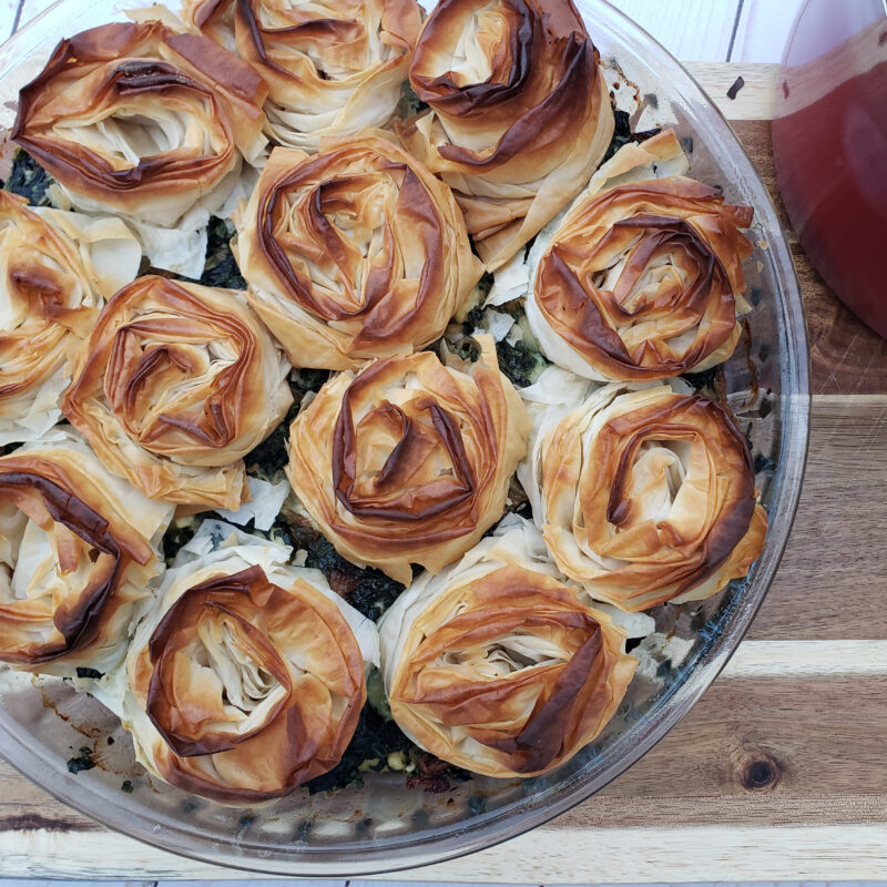 Keep phyllo sheets covered with a damp paper towel. Working with one sheet placed horizontally across your worksurface, brush with melted butter or spray with oil. Using your fingers, pleat dough on the right side, forming a fan. Starting at that end, pleat and turn dough into a spiral until it resembles a rose; place on top of the spinach filling, at the outer edge. Repeat with remaining pastry sheets and place around the edge of the pan. Use 3 roses for the center.