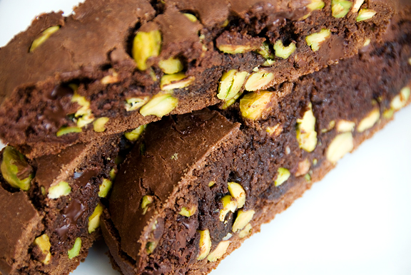 Dip each slice of biscotti diagonally into the melted chocolate. Place on the cooling rack to dry. Allow to dry 30 minutes. Store airtight for 4 days or freeze.