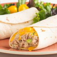 Stir until blended. Divide tuna mixture among 6 wraps, placing the tuna at one edge. Sprinkle with cheeses.