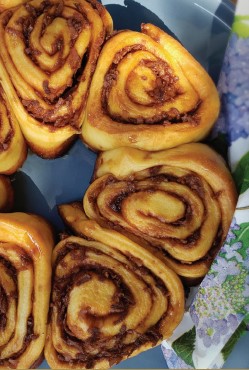 Cut fourteen 1 ½” slices and place 7 rolls in each pan forming a ring and leaving the center empty.
