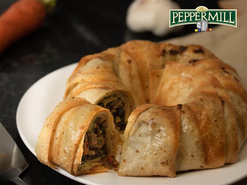 Place vegetable filling into the lined pan and fold overhanging ends to cover the filling. Use trimmed pieces to completely co ver the filling. Bake for 40 Minutes, until wraps are golden and you see the filling bubbling out a bit. Remove from oven and cool.